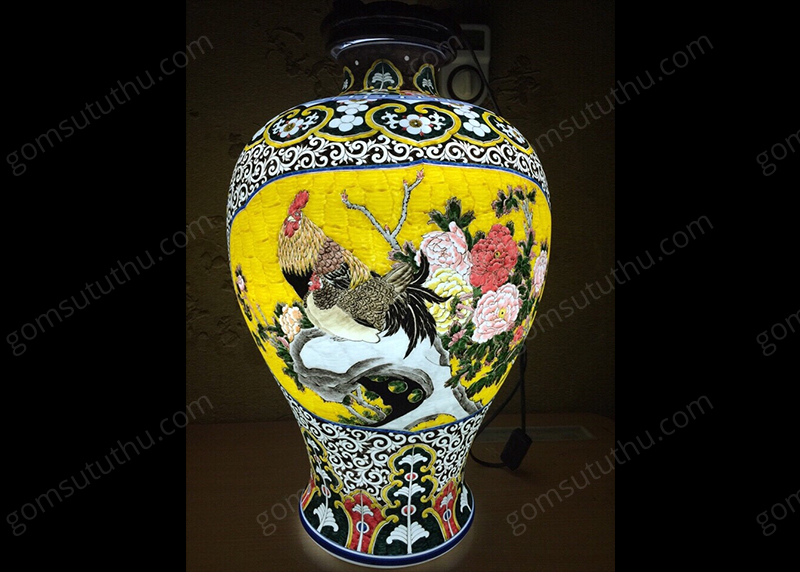 Đèn dáng đùi dế hoa văn phù dung trĩ, gà mẫu đơn lơ băng vàng