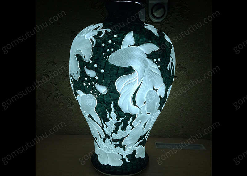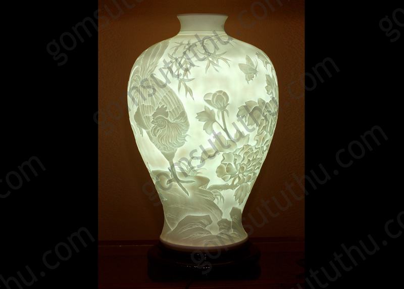 Đèn dáng đùi dế hoa văn phù dung trĩ, gà mẫu đơn lơ băng vàng